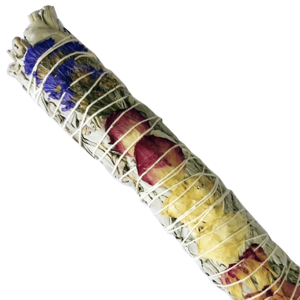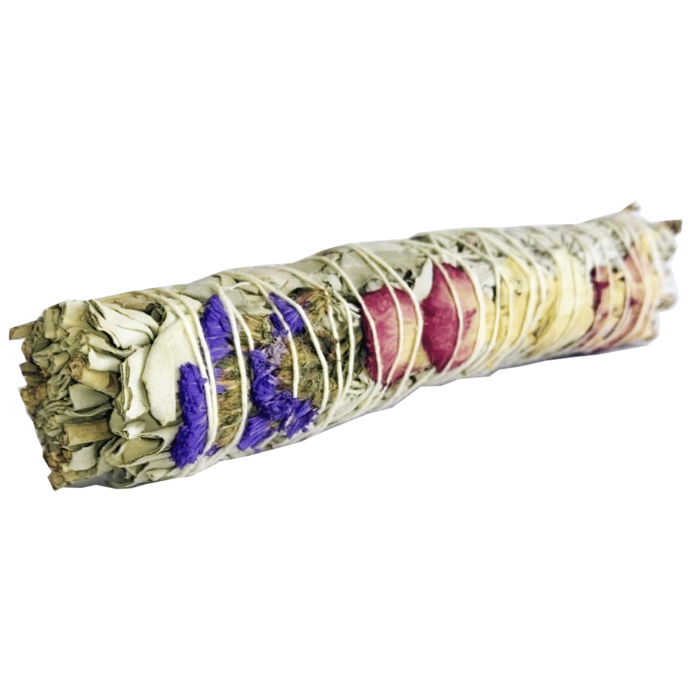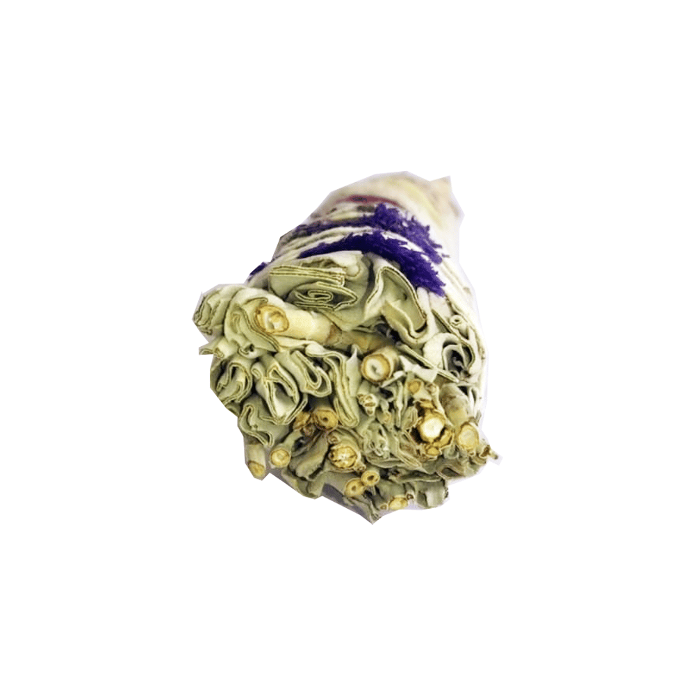 Este atado de 23 cm es una ofrenda en sí mismo. Elaborado con Salvia Blanca (Salvia apiana), clavel rojo, clavel blanco y flor sinuata seca, une la purificación profunda de la salvia con el simbolismo floral del amor, la pureza y la armonía.