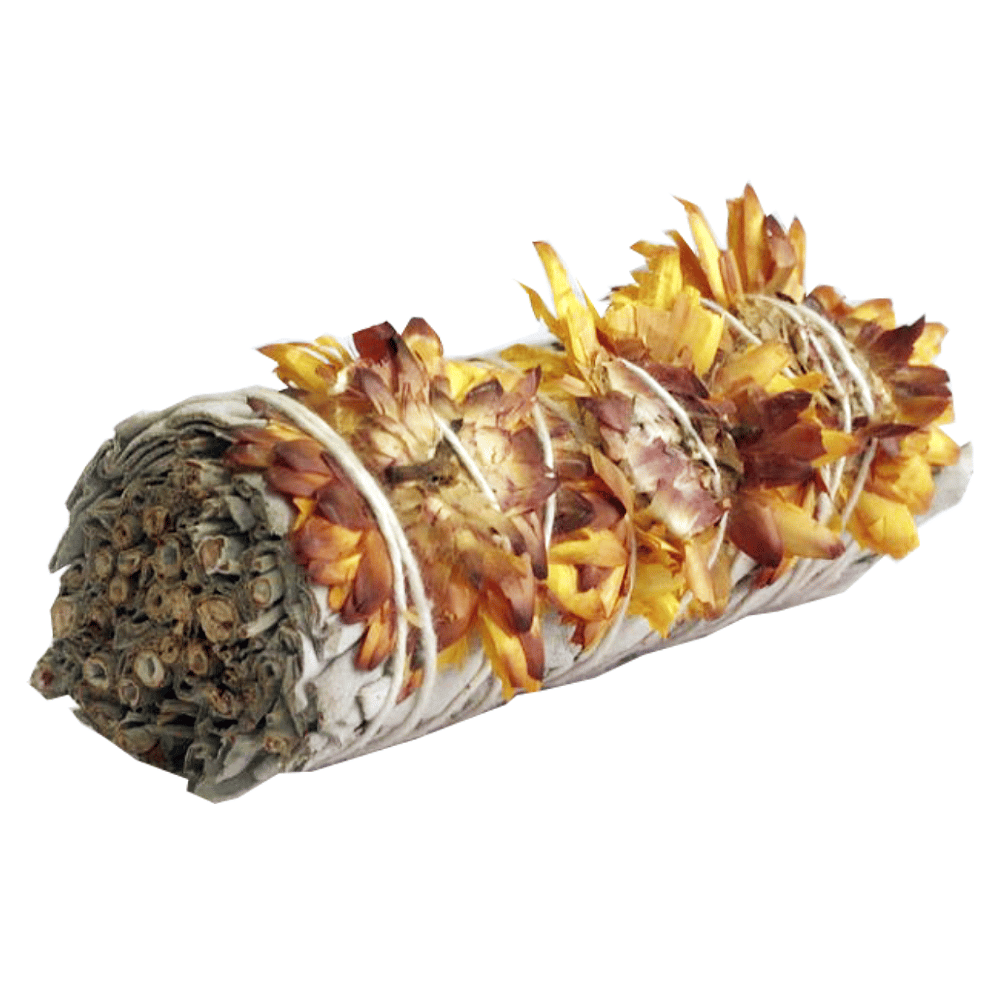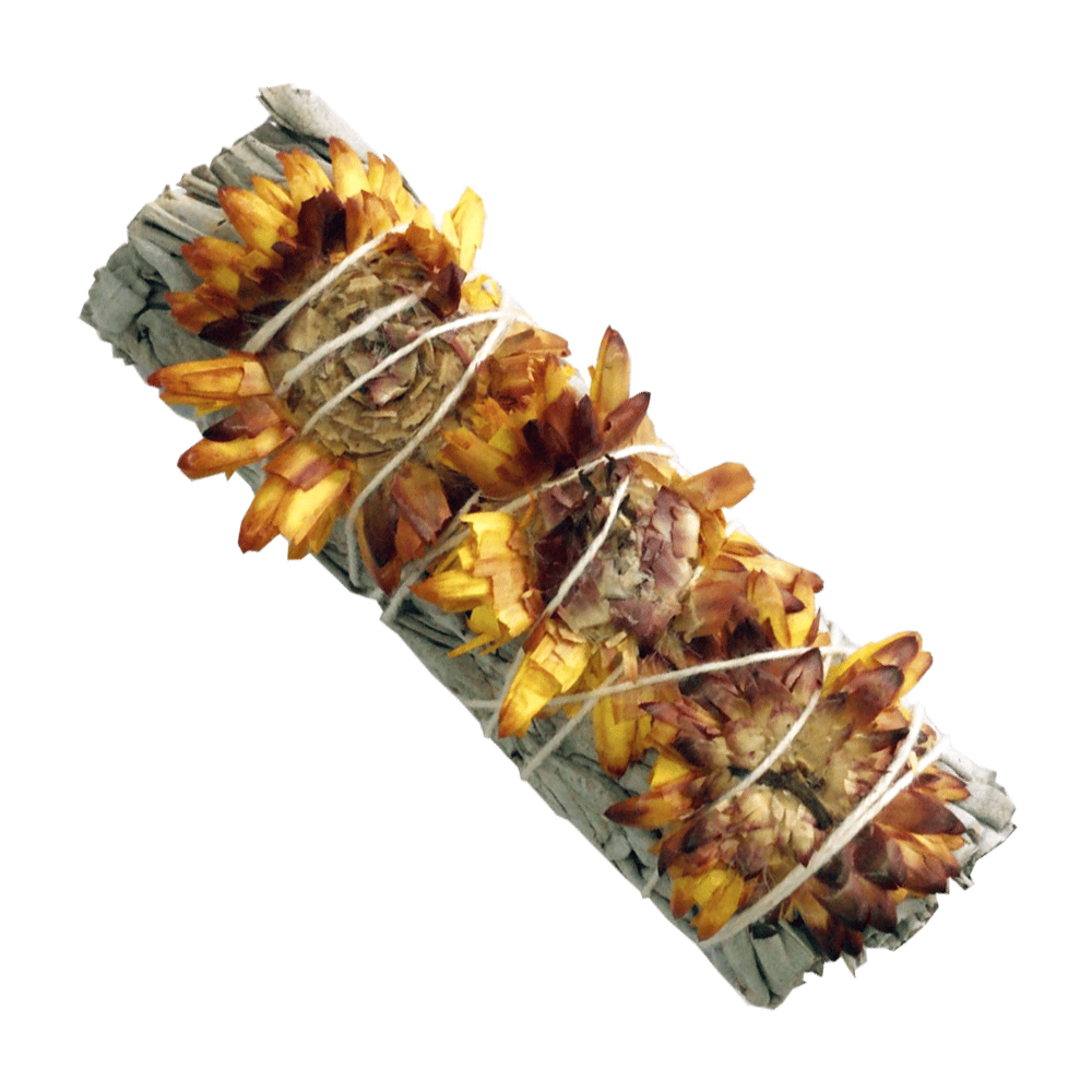 Este atado de 10 cm une la salvia blanca, planta maestra de purificación energética, con la flor de papel naranja (similar a la flor de cempasúchil), símbolo de luz, vida y guía espiritual. Su vibración evoca la conexión con los ancestros, el tránsito entre planos y la apertura del corazón a la gratitud, el perdón y el recuerdo.